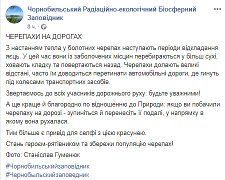 В Чернобыльском радиационно-экологическом биосферном заповеднике предупредили участников дорожного движения, что у болотных черепах наступает период откладывания яиц, поэтому нужно быть осторожнее, чтобы не задавить их.