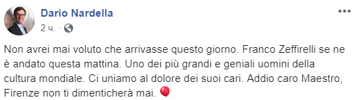 "Я никогда не хотел, чтобы этот день наступил. Франко Дзеффирелли ушел сегодня утром. Один из величайших людей мировой культуры. Мы присоединяемся к боли близких. До свидания, дорогой Мастер, Флоренция никогда не забудет тебя", - написал Нарделла.
