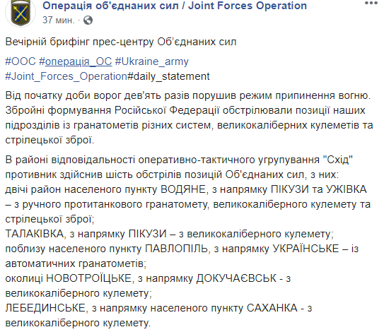 В районе ответственности оперативно-тактического группировки "Восток" боевики совершили шесть обстрелов позиций ООС, из них: дважды район Водяного, по направлению Пикузы и Ужовки - из ручного противотанкового гранатомета, крупнокалиберного пулемета и стрелкового оружия; Талаковка, по направлению Пикузы - из крупнокалиберного пулемета; вблизи Павлополя, по направлению Украинского - из автоматических гранатометов; окраине Новотроицка, по направлению Докучаевска - из крупнокалиберного пулемета; Лебединского, по направлению Саханки - из крупнокалиберного пулемета.