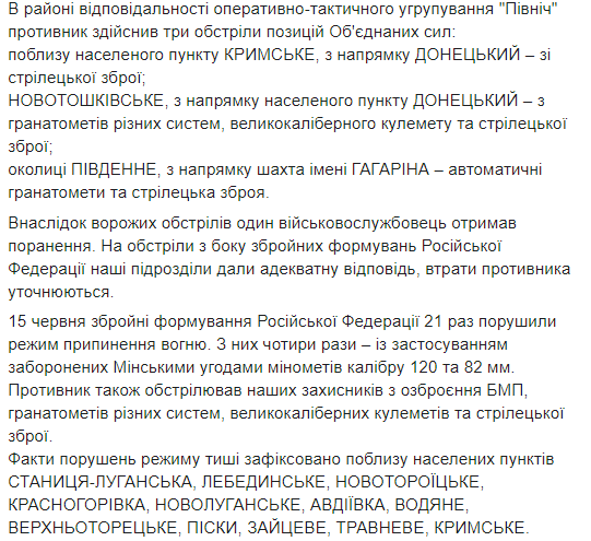 В воскресенье, 16 июня, незаконные вооруженные формирования с начала суток осуществили девять обстрелов позиций в зоне операции объединенных сил (ООС), один украинский военнослужащий получил ранения. Об этом говорится в сводке ООС на странице в Facebook.