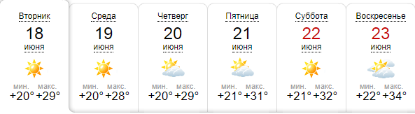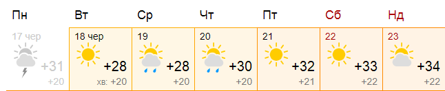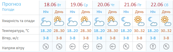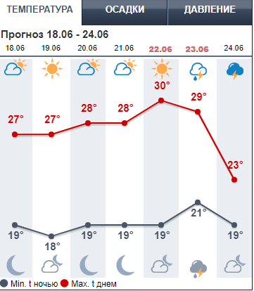 Прогноз Мeteoprog.ua отличается от прогнозов других синоптиков. По данным этого ресурса, с 18 по 21 июня без осадков, днем до +27..+28. В субботу, 22 июня, пригреет до +30, а в субботу и воскресенье ожидается гроза и снижение температуры до +29 и даже до +23 в воскресенье.