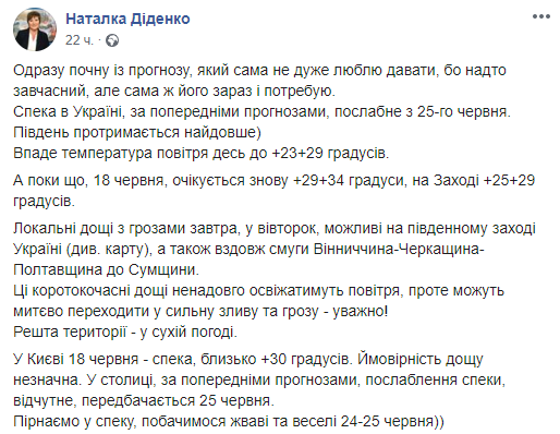 18 июня локальные дожди ожидаются на западе. Полоса дождей протянется по Винницкой, Черкасской, Полтавской, Сумской областям. Кратковременные осадки ненадолго освежат воздух, возможны сильные ливни.