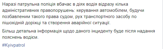 Установлено, что предполагаемый водитель ранее уже лишен судом права управления транспортными средствами за управление в состоянии опьянения и имеет несколько постановлений за управление автомобилем, будучи лишенным такого права. Сейчас патрульная полиция усматривает в действиях водителя сразу несколько административных правонарушений: управление автомобилем, будучи лишенным такого права судом, движение транспортного средства по пешеходной дорожке и создание аварийной ситуации.