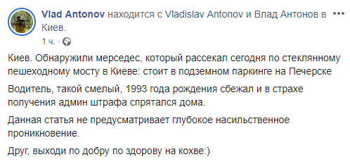 После этого поста, по словам Антонова, с ним связался водитель машины и предложил удалить посты за 100 долларов. По информации журналиста, водитель Mercedes 1993 года рождения. По его словам, он сбежал из страха получить административный штраф и припарковал авто в подземном паркинге на Печерске.