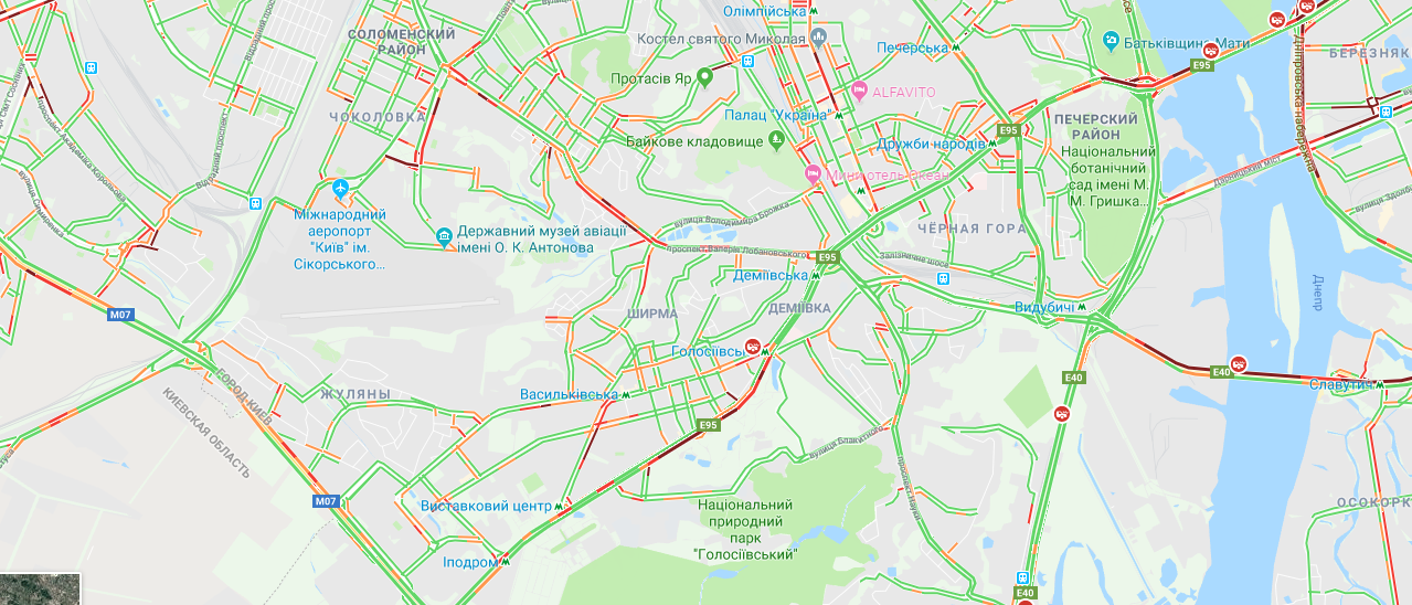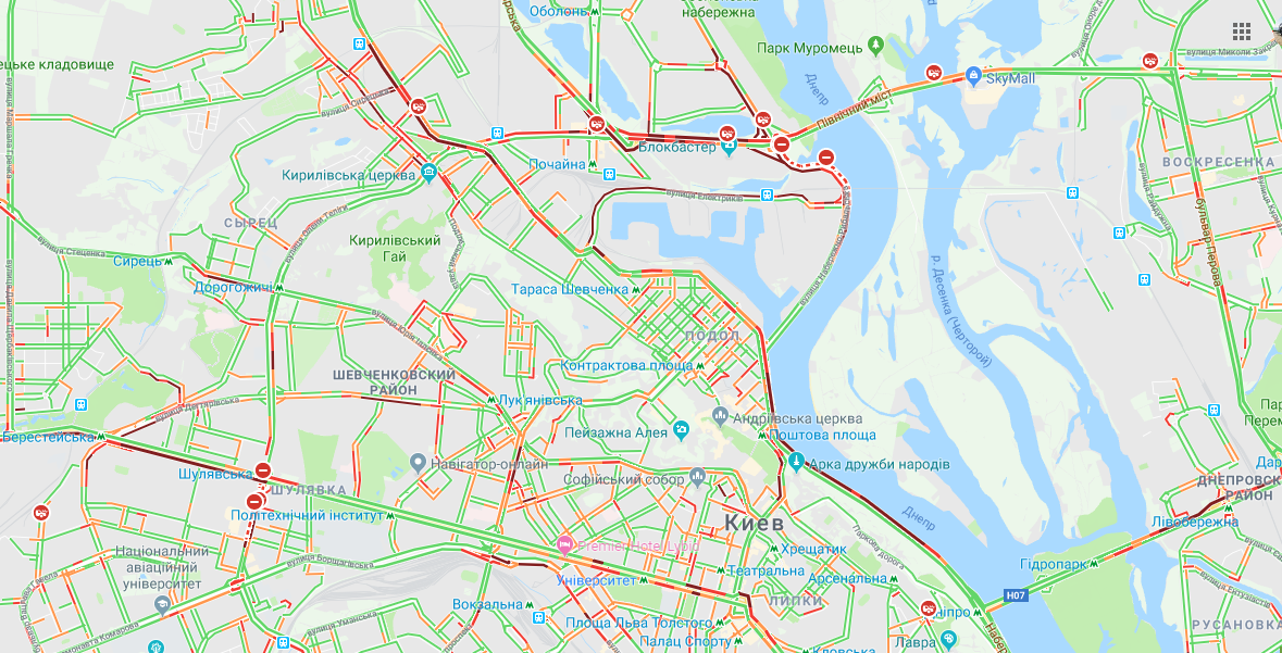 Сложнее всего проехать по проспекту Победы - от метро "Шулявская" до "Житомирской". Также стоят машины на Воздухофлотском проспекте и проспекте Леся Курбаса, улицах Вадима Гетьмана, Юрия Ильенко, Вячеслава Черновола, бульваре Тараса Шевченко, Владимирском спуске, Набережном шоссе, проспекте Валерия Лобановского.