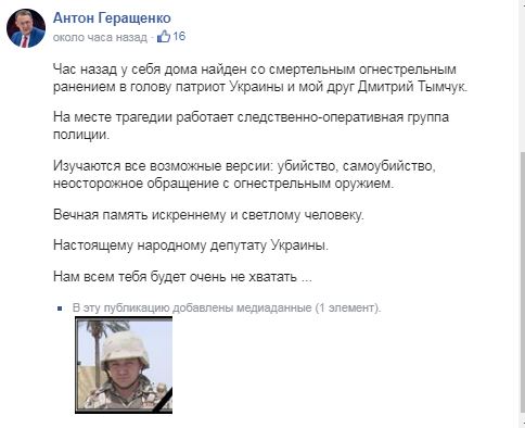 Геращенко добавил возможные версии происшествия, хотя до этого писал только о самоубийстве. "Изучаются все возможные версии: убийство, самоубийство, неосторожное обращение с огнестрельным оружием", - дописал Геращенко. Также он добавил фото Тымчука и фразу "настоящему народному депутату".