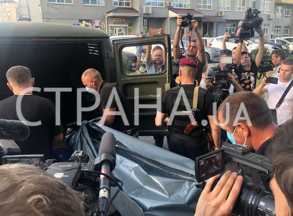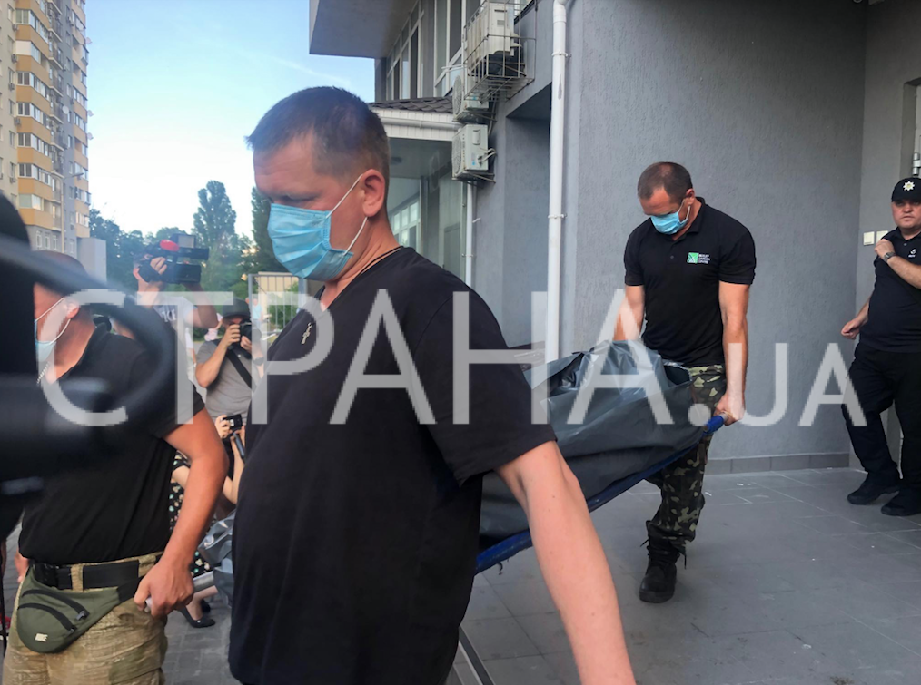 В среду, 19 июня, около 17:50, тело нардепа от "Народного фронта"  Дмитрия Тымчука, которого сегодня нашли застреленным, вынесли из его дома в Киеве и погрузили в спецавтомобиль. Об этом сообщает корреспондент "Страны".
