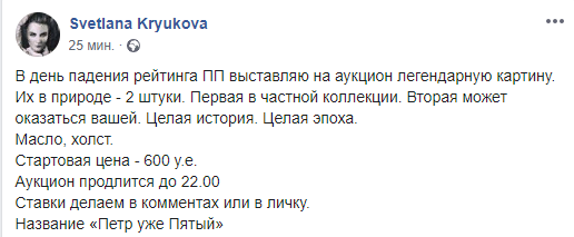 "В день падения рейтинга ПП выставляю на аукцион легендарную картину. Их в природе - 2 штуки. Первая в частной коллекции. Вторая может оказаться вашей. Целая история. Целая эпоха. Масло, холст. Стартовая цена - 600 у.е.", - написала она.
