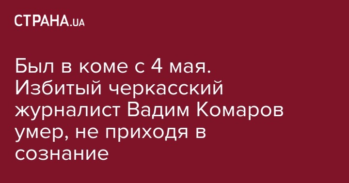 "Сегодня ночью умер черкасский журналист Вадим Комаров, жестоко избитый в центре Черкасс 4 мая. С момента нападения Вадим был без сознания, находился в состоянии комы. Единственная версия покушения, а теперь уже и убийства, которую разделяют черкасские журналисты - именно профессиональная деятельность Вадима Комарова. Он был неудобным для многих местных политиков. Ставил неудобные вопросы о коррупции в Черкассах, поднимал резонансные темы...