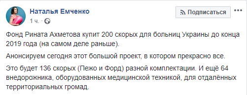 Фонд Рината Ахметова собирается закупить 200 машин скорой помощи для больниц Украины до конца 2019 года. Об этом заявила член Наблюдательного совета Фонда Наталья Емченко на своей странице в Facebook.