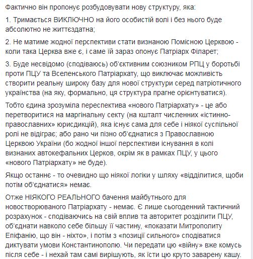 "Единственная понятная перспектива "нового патриархата" - это либо превратиться в маргинальную секту (вроде многочисленных "истинно-православных" юрисдикций), которая существует сама для себя и никакой общественной роли не играет; либо рано или поздно объединиться с Православной церковью Украины (так как никакой другой перспективы существования в кругу признанных автокефальных церквей, кроме как в рамках ПЦУ, у этого "нового патриархата" не будет)", - считает архиепископ.
