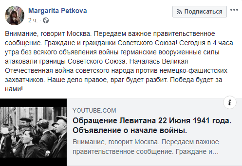 Публицистка и поэтесса Маргарита Петкова опубликовала на странице в Facebook обращение Левитана, которое транслировалось 22 июня 1941 года.