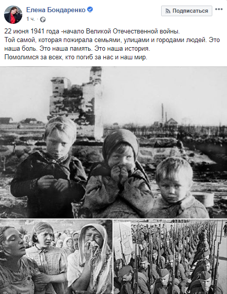 "22 июня 1941 года -начало Великой Отечественной войны. Той самой, которая пожирала семьями, улицами и городами людей. Это наша боль. Это наша память. Это наша история. Помолимся за всех, кто погиб за нас и наш мир", - написала экс-депутат Елена Бондаренко.