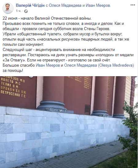 "Убрали "общественный туалет", собрали мусор и бутылки вокруг, отмыли ещё часть "наскальных рисунков" пещерных людей, а так же помыли сам монумент. Следующий шаг - акцентировать внимание на необходимости реставрации. Постараюсь на днях узнать размеры "колодки" от медали "За Отвагу". Если не отреагируют - изготовлю за свой счёт", - написал он.
