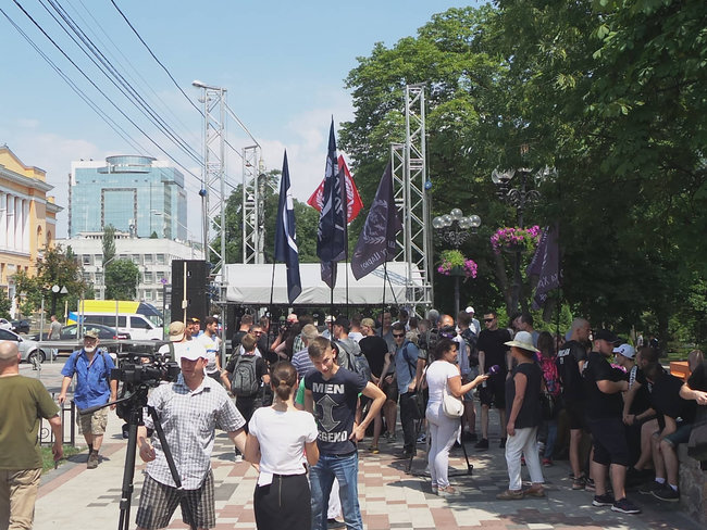 Протестующие собрались в парке Шевченко, напротив входа в главный корпус университета им. Шевченко. Там оснащена небольшая сцена, стоит аппаратура, стулья. Среди участников акции протеста - члены "Правого сектора", организации "Традиции и порядок", других организаций.
