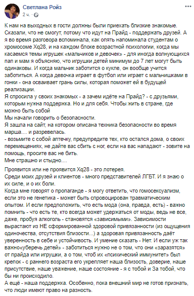 Психолог Светлана Ройз написала, что заботиться нужно не о том, что дети "заразятся" от прайда, а о том, чтоб их "психический иммунитет" был крепок. И что с раннего возраста его укрепляет близость, доверие, уважение взрослых и напоминание "я с тобой и за тобой, что бы ни происходило"