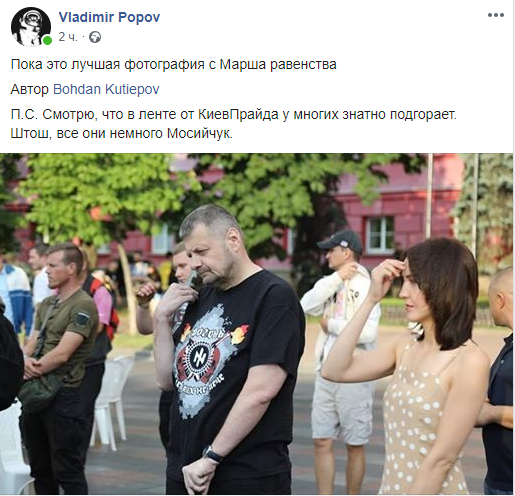 "Пока это лучшая фотография с Марша равенства. П.С. Смотрю, что в ленте от КиевПрайда у многих знатно подгорает. Штош, все они немного Мосийчук", - написал блогер Владимир Попов.
