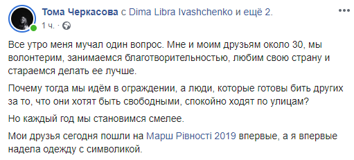 Мои друзья сегодня пошли на Марш Рівності 2019 впервые, а я впервые надела одежду с символикой".
