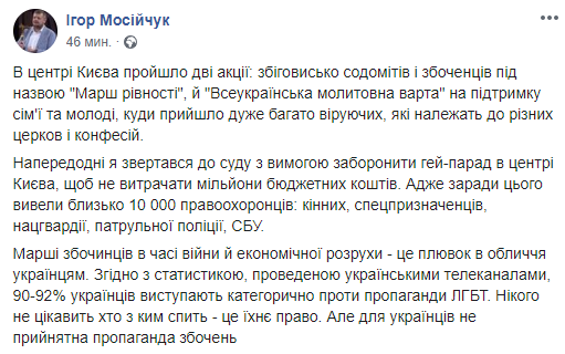 Нардеп от Радикальной партии Игорь Мосийчук, который ранее через Окружной админсуд Киева пытался добиться запрета на проведение шествия, сегодня присутствовал в рядах противников ЛГБТ в парке Шевченко. На своей странице в Facebook он назвал ЛГБТ-парад плевком в лицо обществу.