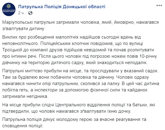 Как сообщают мариупольские полицейские, вызов о развращении малолетних поступил днем ​​от несовершеннолетнего. Мальчик сообщил полицейским, что по улице Троицкой в ​​компании друзей подошел неизвестный и начал расспрашивать об интимных вещах. После этого мужчина, угрожая ножом, повел 10-летнюю девочку на территорию детского сада, который находится неподалеку.