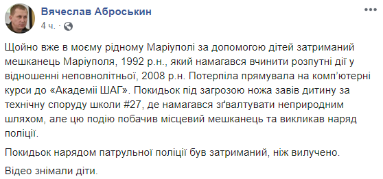 По словам Аброськина, житель Мариуполя, 1992 г.р. под угрозой ножа завел девочку за техническое сооружение школ № 27, когда она направлялась на курсы к "Академии ШАГ".