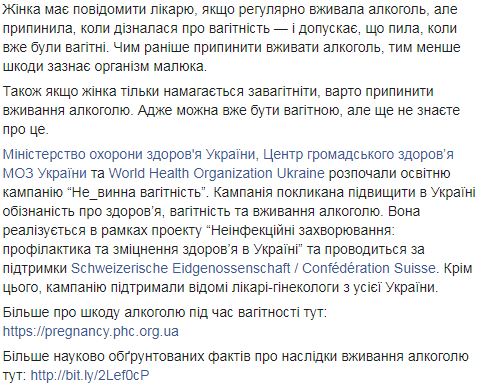 И.о. министра здравоохранения Ульяна Супрун заявила, что беременным женщинам противопоказан алкоголь даже в маленьких дозах, поскольку это может повлиять на развитие ребенка. Об этом она сообщила на своей странице в Facebook 24 июня.