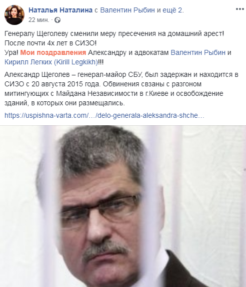 В среду, 26 июня 2019, освобожден из СИЗО генерал-майор СБУ Александр Щеголев, который обвинялся в участии в операции против Евромайдана в Киеве (зима 2014/15) и освобождении захваченных тогда зданий.