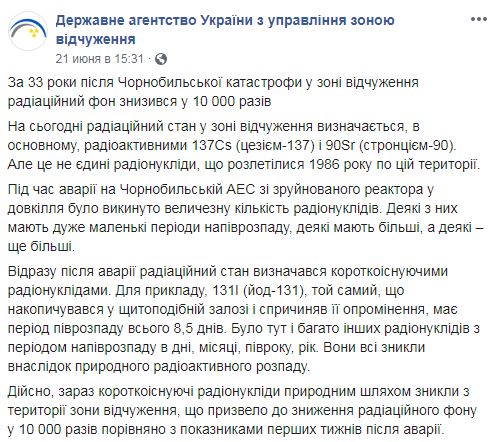 "Однако часть земель зоны отчуждения все еще остается непригодной для постоянного проживания и хозяйствования человека, ведь эти земли были загрязнены не только короткоживущими радионуклидами. На этой территории также осели в опасных количествах и трансурановые элементы, в частности изотопы 239, 240 Pu (плутония-239 и плутония-240), периоды полураспада которых составляют 24 и 6,5 тысячи лет", - пишет Госагентство.