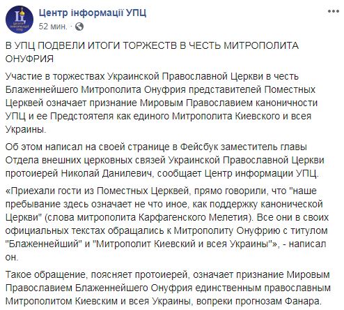 Он также добавил, что эти обращения имели не личный характер отдельных иностранных епископов, выражая их собственную точку зрения, а были использованы в официальных текстах приветствий за подписью предстоятелей поместных церквей. "Никто не оспаривает титул "Митрополит Киевский и всея Украины". Для всех поместных церквей, кроме Фанара, именно Онуфрий является законным митрополитом Киевским и всея Украины", - сообщил Данилевич.
