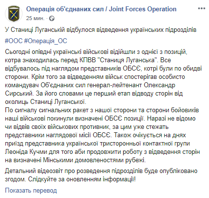 "Сегодня в полдень украинские военные отошли с одной из позиций, которая находилась перед КПВВ "Станица Луганская". Все происходило под наблюдением представителей ОБСЕ, которые были по обе стороны. Кроме того, за отводом войск наблюдал лично командующий объединенными силами генерал-лейтенант Александр Сырский. По его словам, это первый этап отвода сторон от окраин Станицы", – сказано в сообщении штаба ООС.