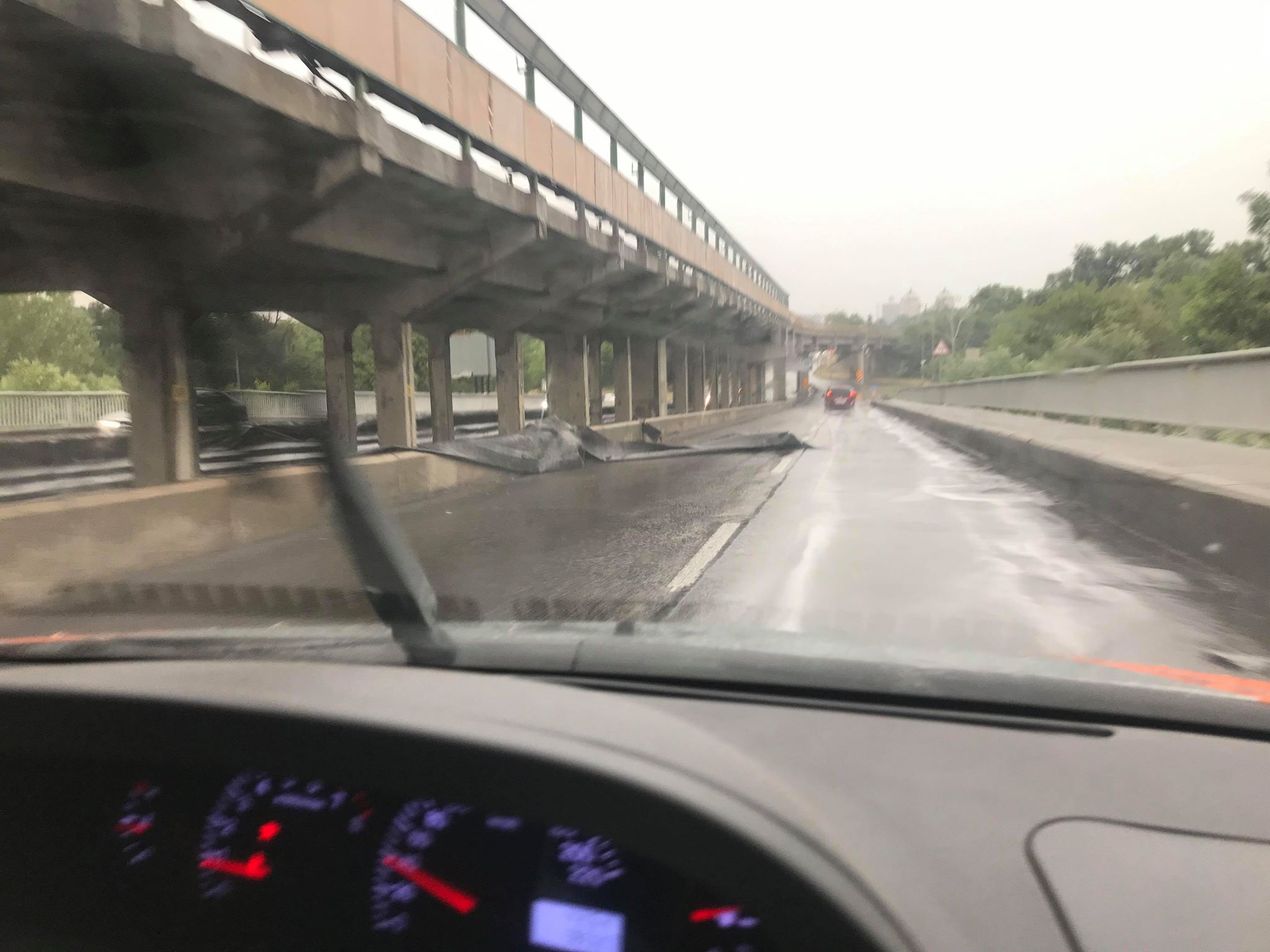 На съезде с моста Метро в сторону Левого берега сорвало обшивку моста, которая перекрыла одну полосу движения.