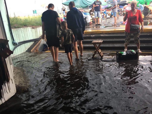 В обед ливень затопил несколько улиц в Киеве. Автомобили вынуждены были выезжать на проспект Героев Сталинграда по самые номера в воде.