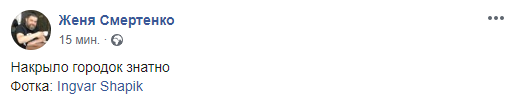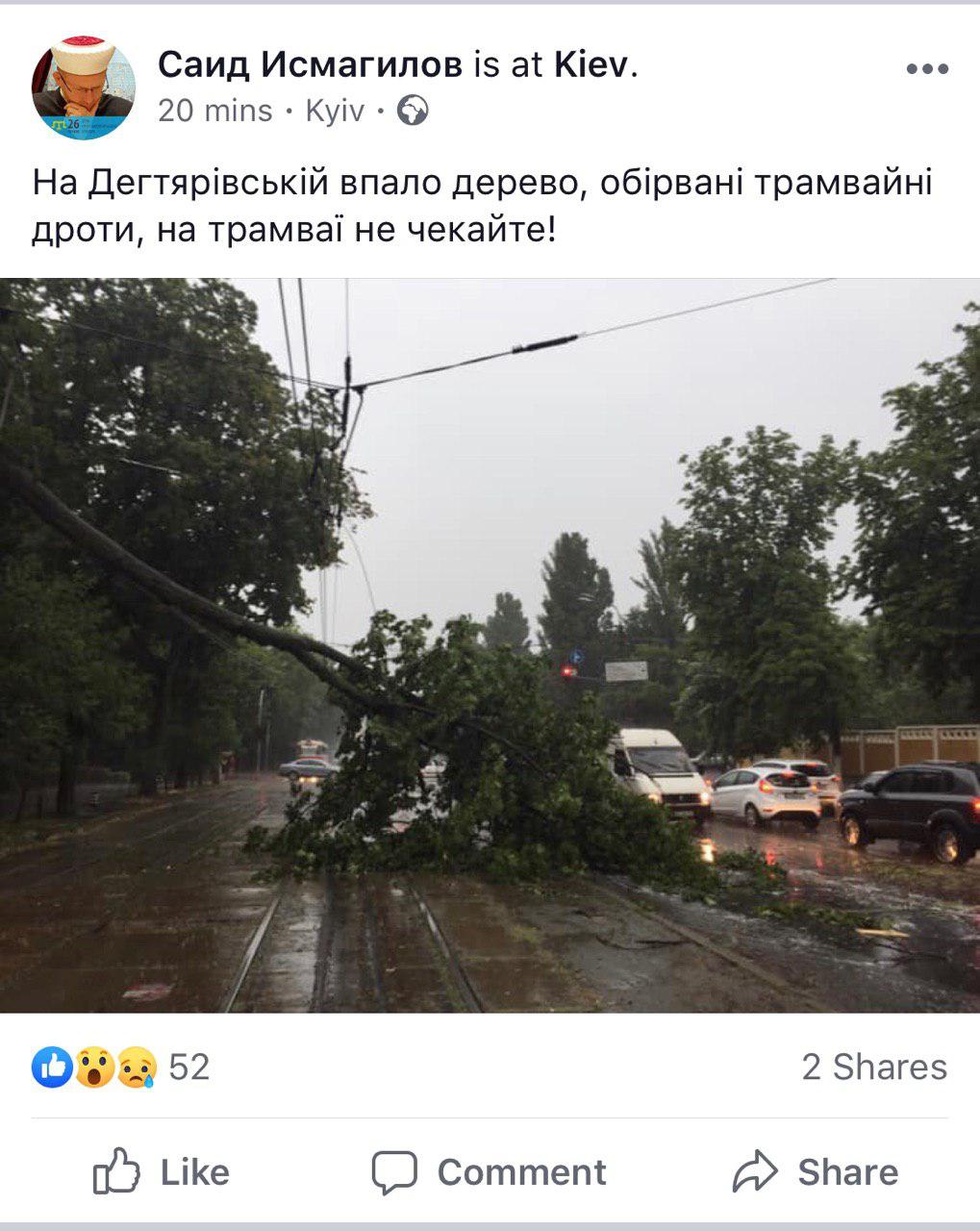 27 июня, после долгих жарких дней, около 12:30 Киев накрыл ливень. Небо затянуло тучами буквально за полчаса, а налетевшая на столицу гроза сопровождался сильными порывами ветра. Буря прошлась по всем районам города. Шторм повалил деревья на дорогу и автомобили, срывал кровли.