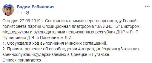 Об освобождении сообщил второй номер списка партии "Оппозиционная платформа – За жизнь" Вадим Рабинович. По его словам, глава политсовета "Оппоплатформы" Виктор Медведчук встретился с главами неподконтрольных территорий Донецкой и Луганской областей 27 июня. "Сегодня 27.06.2019 г. Состоялись прямые переговоры между Главой политсовета партии Опозиционная платформа "За жизнь" Виктором Медведчуком и руководителями непризнанных республик "ДНР" и "ЛНР" Пушилиным Д.В. и Пасечником Л.И. 1. Обсуждался ход выполнения Минских соглашений. 2. Принято решение об освобождении 4-х граждан Украины (3-х из них военнослужащих) удерживаемых в Донецке и Луганске", – написал Рабинович в Facebook и приложил список фамилий.