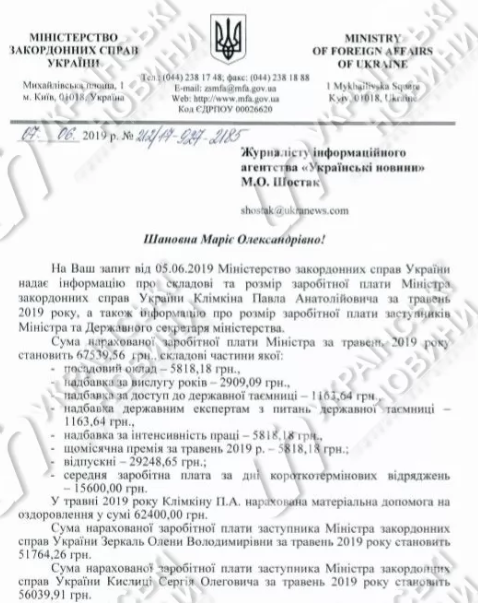 Так, зарплата Климкина за май составила 130 000 гривен при окладе в 5 818 гривен. В прошлом месяце министру начислили 62 400 гривен материальной помощи на оздоровление.