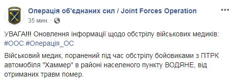 "Военный медик, раненный при обстреле боевиками из ПТРК автомобиля "Хаммер" в районе населенного пункта Водяное, от полученных травм скончался", - пишет пресс-центр.