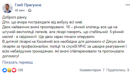 "Двух тяжелых ночью прооперировали. 16-летний парень все еще на искусственной вентиляции легких, но врачи говорят, что стабильный. 5-летний малый - в сознании. Еще двух сейчас начали оперировать", - написал он.