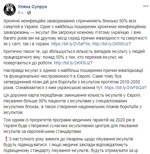 По ее данным, уже много лет инсульт на втором месте среди причин инвалидности и смертности как в мире, так и в Украине. Супрун также пишет, что с 2020 года в Украине начнут создавать современные инсультные центры по евростандартам, если осенью все учреждения специализированной помощи подпишут договор с Национальной службой здоровья.