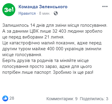 На странице команды Зеленского в Facebook напоминают украинцам, что осталось всего 14 дней для смены места голосования. А по данным ЦИК только 32 403 человека сделало это перед выборами 21 июля.
