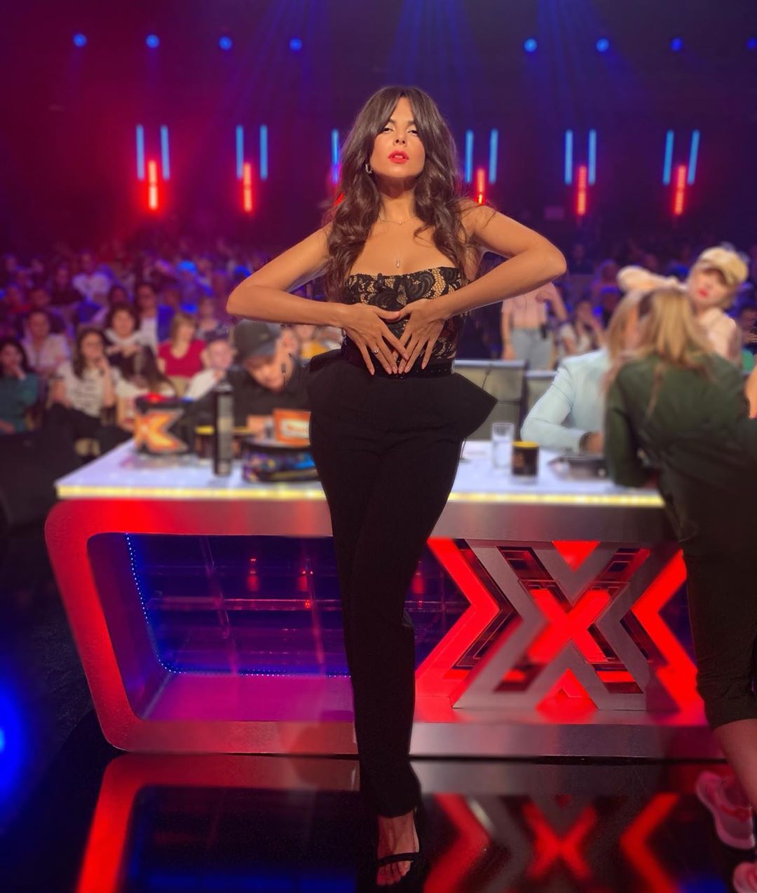 На этот раз артистка появилась в роли судьи на популярном шоу талантов Х-фактор в утягивающем корсете без бретелей, который подчеркивает бюст.