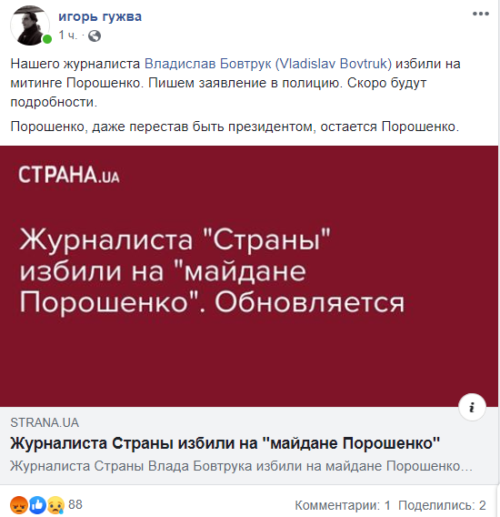 "Нашего журналиста Владислава Бовтрука избили на митинге Порошенко. Пишем заявление в полицию. Скоро будут подробности. Порошенко, даже перестав быть президентом, остается Порошенко", - написал главный редактор "Страны" Игорь Гужва на своей странице в Facebook.