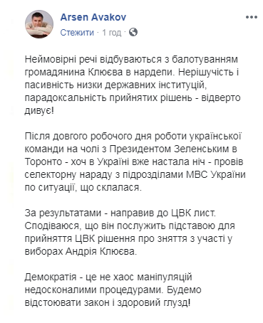 По результатам - направил в ЦИК письмо. Надеюсь, что оно послужит основанием для принятия ЦИК решения о снятии с участия в выборах Андрея Клюева", - написал Арсен Аваков.