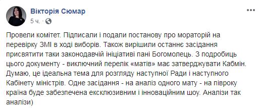 "Решили последнее заседание посвятить таки законодательной инициативе госпожи Богомолец. Из подробностей этого документа - исключительный перечень "матов" должен утверждать Кабмин. Думаю, это идеальная тема для рассмотрения следующей Рады и следующего Кабинета министров", - написала Сюмар. Она также сообщила, что комитет подписал и зарегистрировал в парламенте проект постановления о моратории на проверку СМИ в ходе выборов.