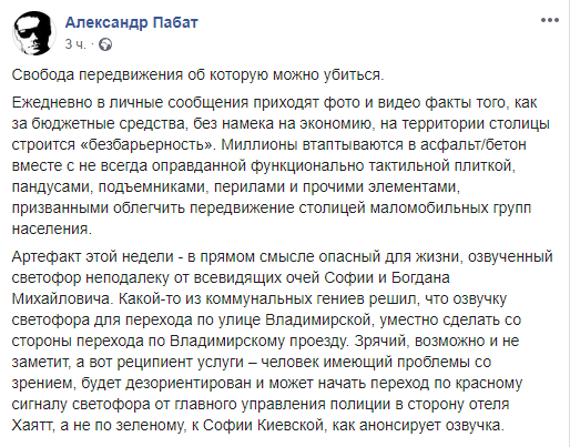 "Артефакт этой недели - в прямом смысле опасный для жизни, озвученный светофор неподалеку от всевидящих очей Софии и Богдана Михайловича. Какой-то из коммунальных гениев решил, что озвучку светофора для перехода по улице Владимирской, уместно сделать со стороны перехода по Владимирскому проезду. Зрячий, возможно и не заметит, а вот реципиент услуги – человек имеющий проблемы со зрением, будет дезориентирован и может начать переход по красному сигналу светофора от главного управления полиции в сторону отеля Хаятт, а не по зеленому, к Софии Киевской, как анонсирует озвучка", - отметил Пабат.