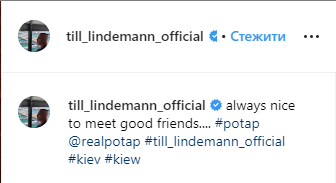 При этом автор поста не сделал подписи к фото, а лишь тегнул Тилля. Рок-музыкант отреагировал на публикацию и на своей странице написал под фото, что это встреча со старым другом. Причем, она состоялась в Киеве.