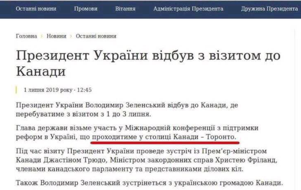 Владимир Зеленский отправился с визитом в Канаду и 4 июля его пресс-служба, в сообщении на сайте Администрации президента, указала, что он примет участие в конференции в Торонто, который ошибочно назвали столицей Канады. На самом деле столица Канады - Оттава.