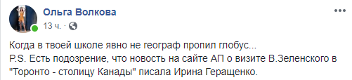 P.S. Есть подозрение, что новость на сайте АП о визите В.Зеленского в "Торонто - столицу Канады" писала Ирина Геращенко", - написала журналист Ольга Волкова.