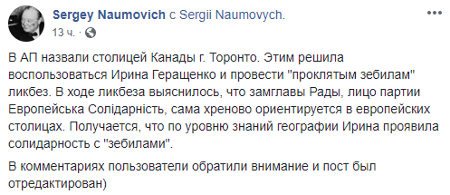 "В АП назвали столицей Канады г. Торонто. Этим решила воспользоваться Ирина Геращенко и провести "проклятым зебилам" ликбез. В ходе ликбеза выяснилось, что замглавы Рады, лицо партии Европейська Солідарність, сама хреново ориентируется в европейских столицах. Получается, что по уровню знаний географии Ирина проявила солидарность с "зебилами", - написал правозащитник, блогер Сергей Наумович.