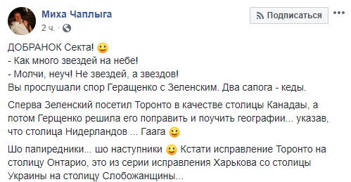 Сперва Зеленский посетил Торонто в качестве столицы Канады, а потом Геращенко решила его поправить и поучить географии... указав, что столица Нидерландов ... Гаага :)