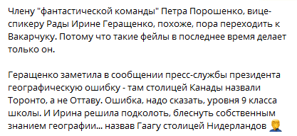 "Члену "фантастической команды" Петра Порошенко, вице-спикеру Рады Ирине Геращенко, похоже, пора переходить к Вакарчуку. Потому что такие фейлы в последнее время делает только он.